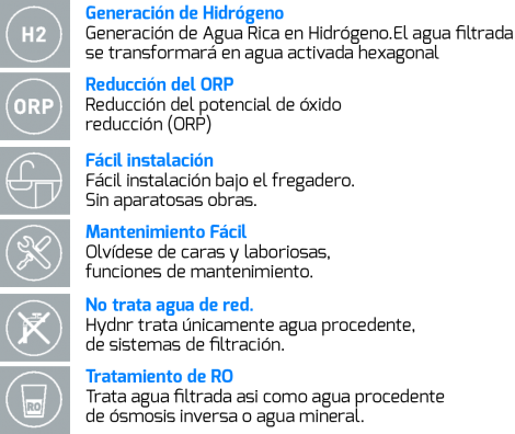 - Por su diseño patentado, altas concentraciones de hidrógeno desde 800 - 1200 incluso, o más, dependiendo de la calidad del agua.